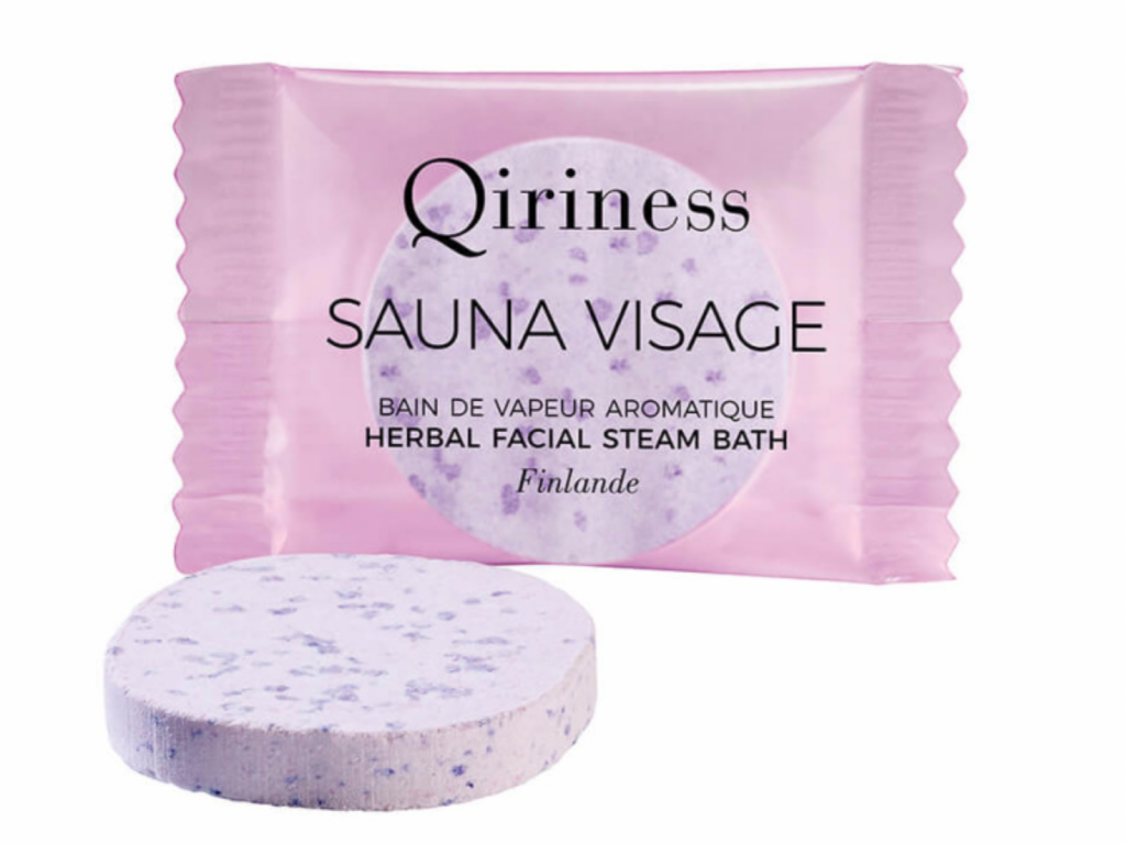 L’étape du bain de vapeur avec le fameux Sauna Visage est une étape clé du rituel Qiriness. Le produit se présente sous forme d’un galet effervescent formulé à base de plantes qu’il faut plonger dans l’eau chaude pour laisser la vapeur libérer ses bienfaits. Peau détendue, détoxifiée, et effet relaxant garanti au rendez-vous !