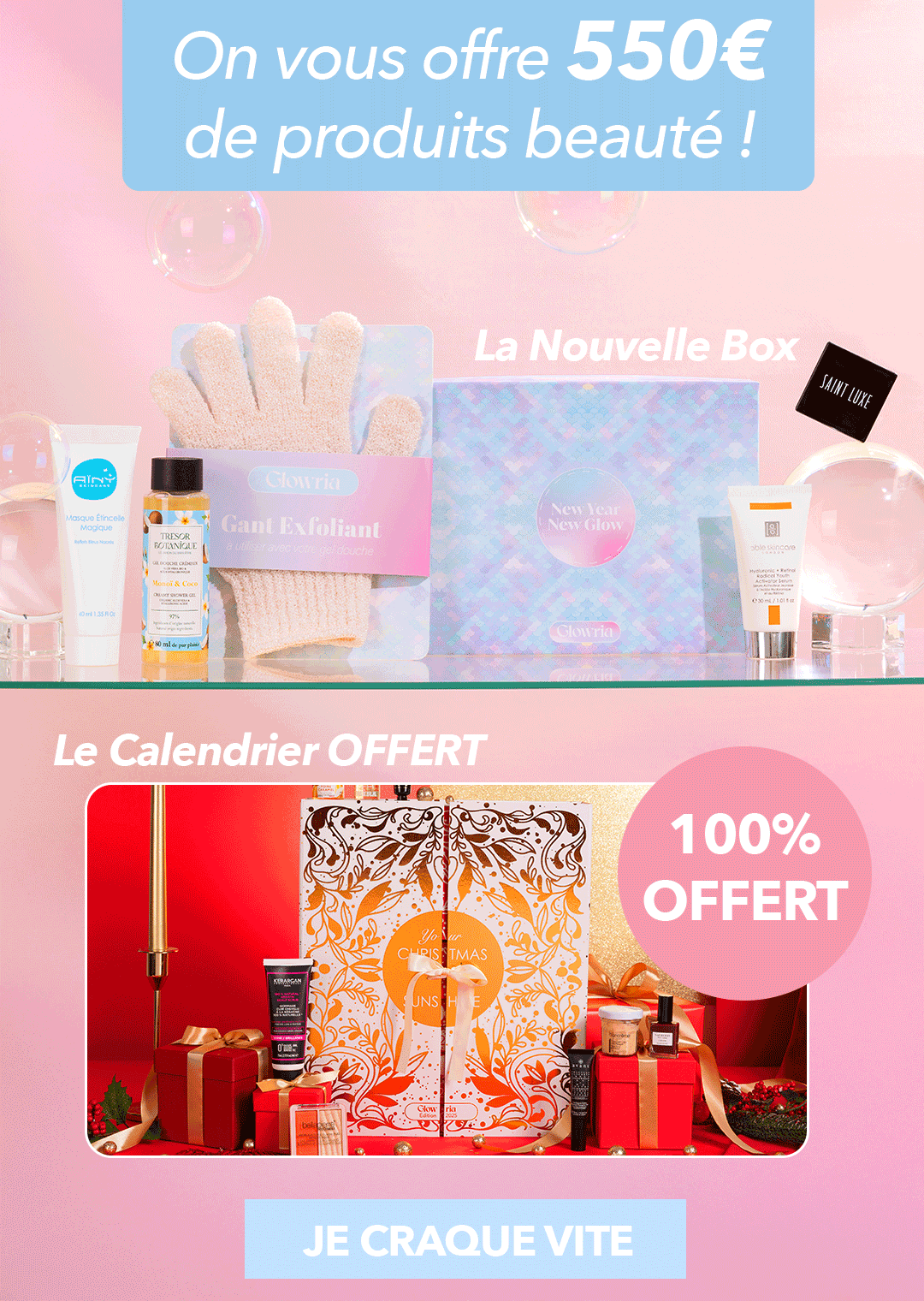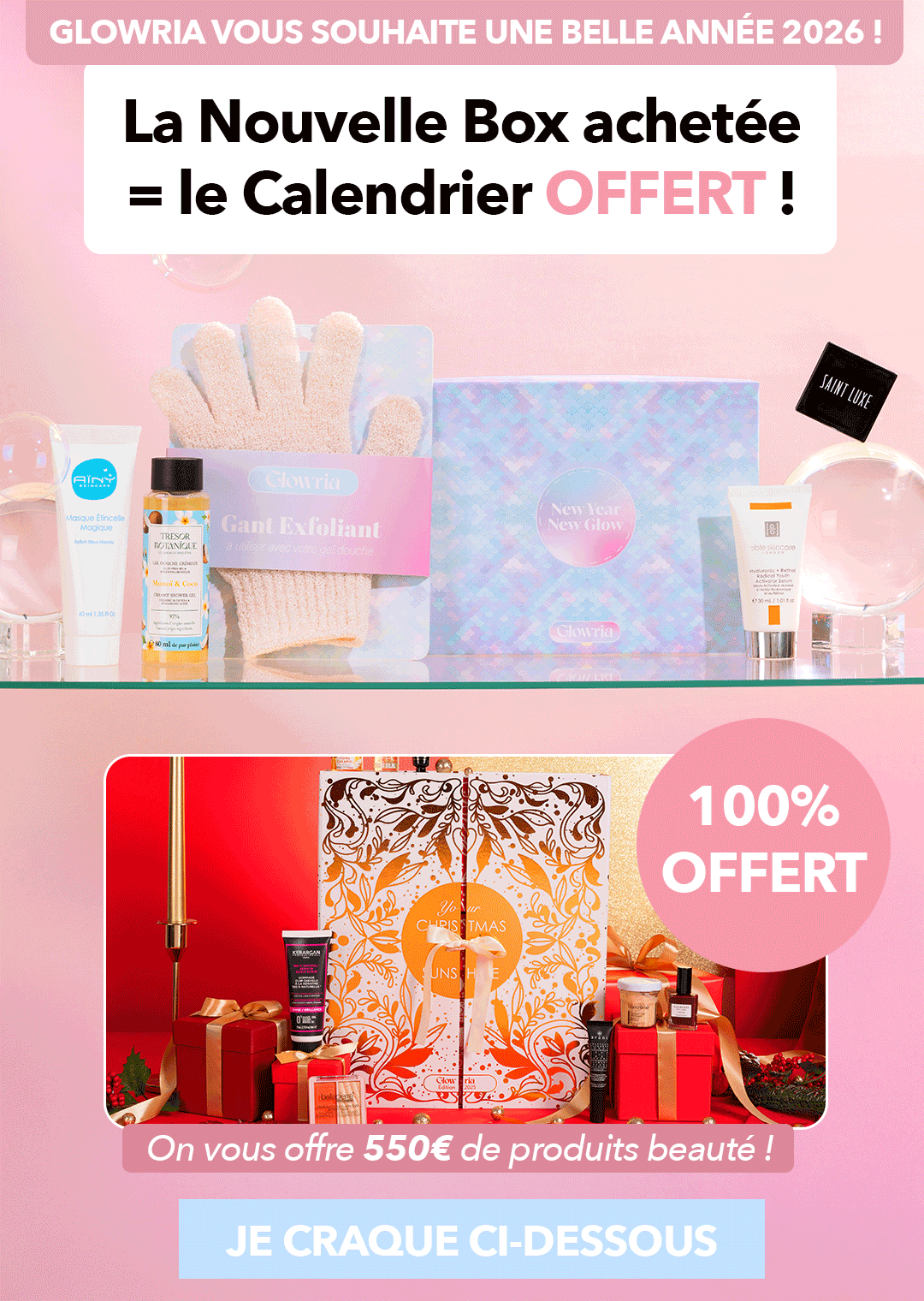 La Nouvelle Box achetée = le Calendrier 100% OFFERT ! On vous offre 550€ de produits pour démarrer l'année en beauté. Waouh !